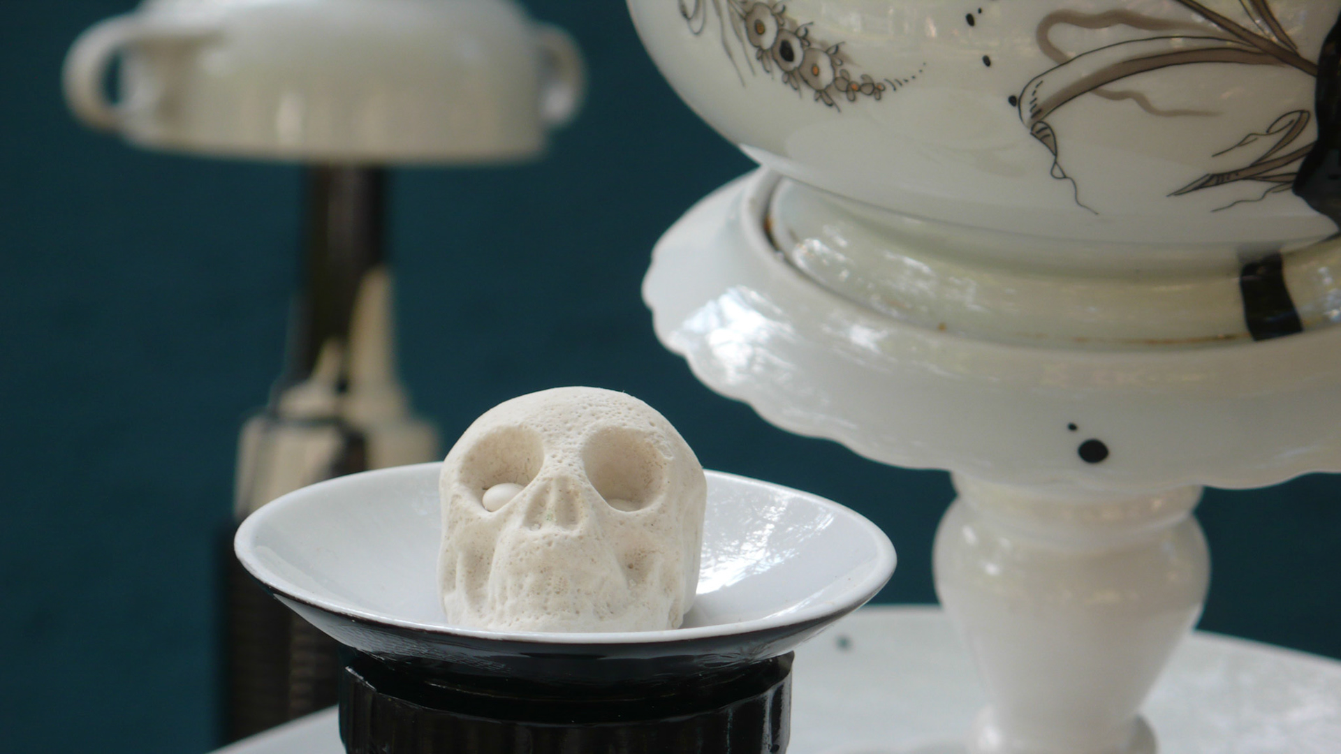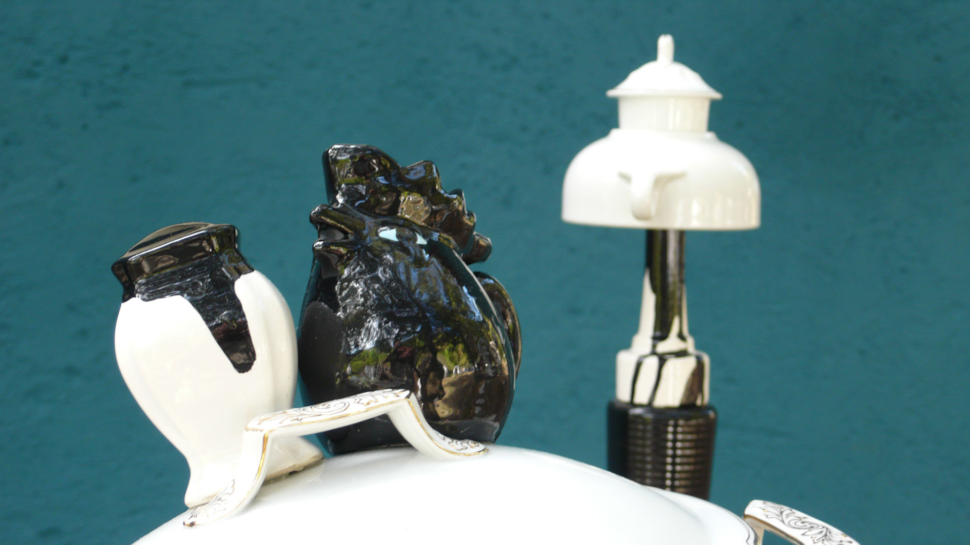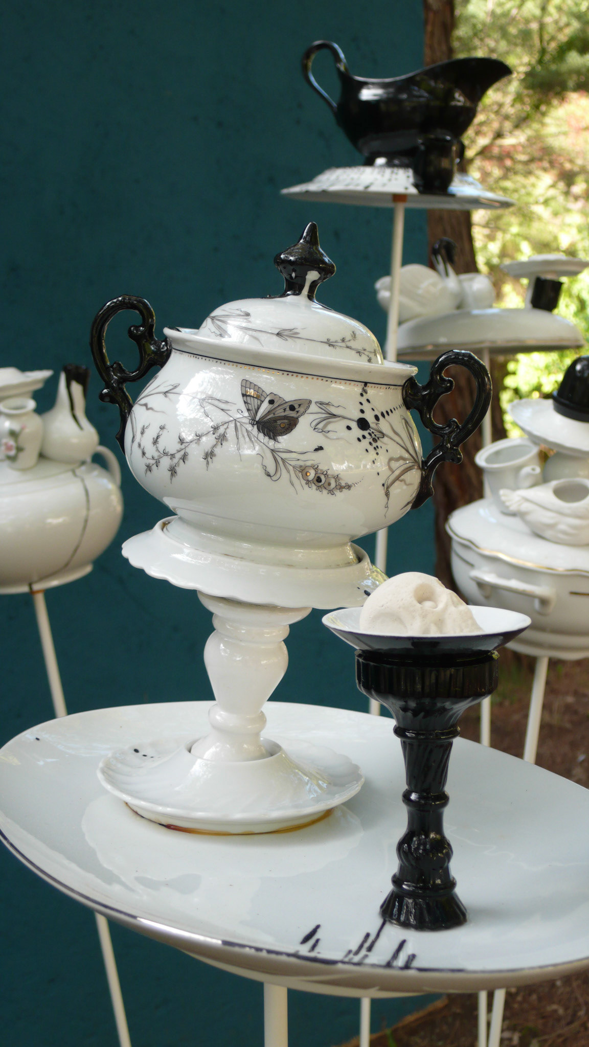 "Le cauchemar de grand-mère". Recycler la vaisselle grand-mère en déjeuner instable sur l’herbe "Oma's Nightmare". recycling grandma's dishware into a instable "déjeuner sur l'herbe" Nomadic Village 2014 -